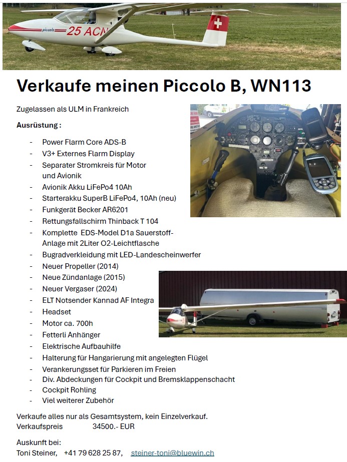Wir verkaufen im Auftrag des Eigentümers folgenden Technoflug Piccolo in sehr gutem Zustand inkl. Hänger in mäßigem Zustand.